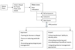 Integrated pest management (IPM) is a decision-based approach that involves optimizing the pest population below the economic threshold by the coordinated use of multiple tactics in an economically and environmentally sound manner. The adoption of IPM in farming practices prevents long-term pest damage by combining biological control, modification of cultural practices, habitual manipulation, and use of resistant varieties. In Nepal, mostly in hilly regions, haphazard chemical pesticide application has inevitable effects on human health, the environment, and the ecosystem. The haphazard chemical pesticide application in Sindhupalchok, Nepal originated mostly due to a knowledge gap in the identification of the stages of the lifecycle of pests, and the distinction between beneficial and harmful insects.  To compare the effectiveness of management practices between IPM adopters and non-adopters this study was framed for six months in Sangachokgadi municipality, Sindhupalchok, Nepal.  The knowledge gap among the maize growers in Sindhupalchok was assessed using both primary and secondary data collection methods. For primary data collection a comprehensive and structured questionnaire, face-to-face interview, phone call interview, and Key Informant Interview was conducted. Similarly, secondary data was collected from various articles and publications from Maize Zone, the Ministry of Agriculture and Livestock Development (MoALD), Nepal Agriculture Research Council (NARC), and National Maize Research Program (NMRP). The collected data were then analyzed (descriptive statistics, chi-square test, and indexing) by using computer software packages i.e., Statistical Package for Social Science (SPSS) version 26, and Microsoft Excel 2010. The analyzed data revealed maize growers adopting IPM practices for crop management are known to have significantly better knowledge of the life cycle of pests, were able to distinguish between beneficial and harmful insects, and had knowledge of appropriate fertilizer doses.  Further, the findings revealed IPM adopters had better knowledge of chemical pesticide handling which could minimize the chemical hazards among the farmers.